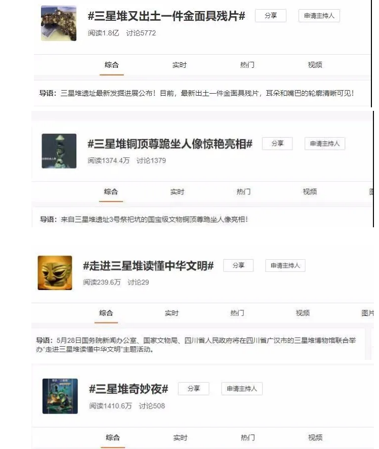 新浪微博話題 #三星堆又出土一件金面具殘片##三星堆銅頂尊跪坐人像驚艷亮相# #走進三星堆讀懂中華文明##三星堆奇妙夜##三星堆奇妙夜直播#等相關話題累計閱讀量都很高!